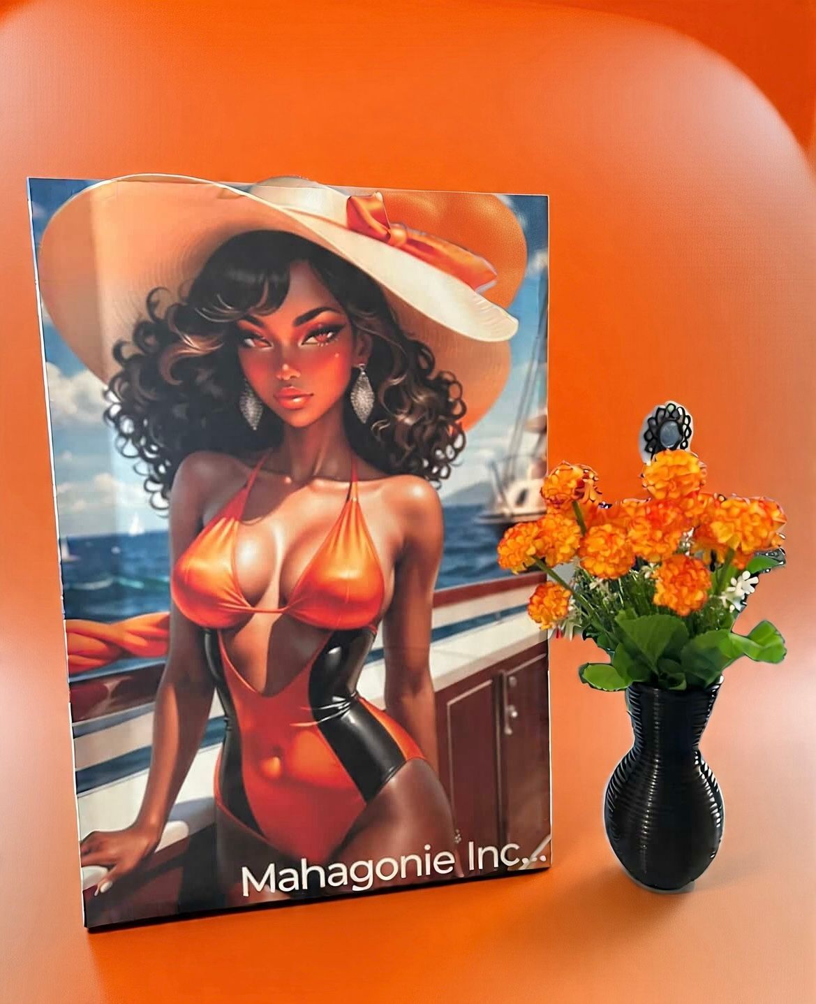Bold tangerine orange with a hint of black, ocean back drop with a soothing tone.